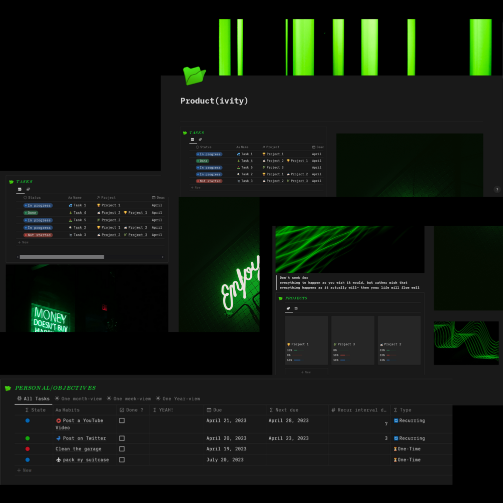 project table, super user friendly, know exactly where is your project (Done, in progress, not started). 3 progressions bars help you see in just a second how far your are from completed it. This template will help you :